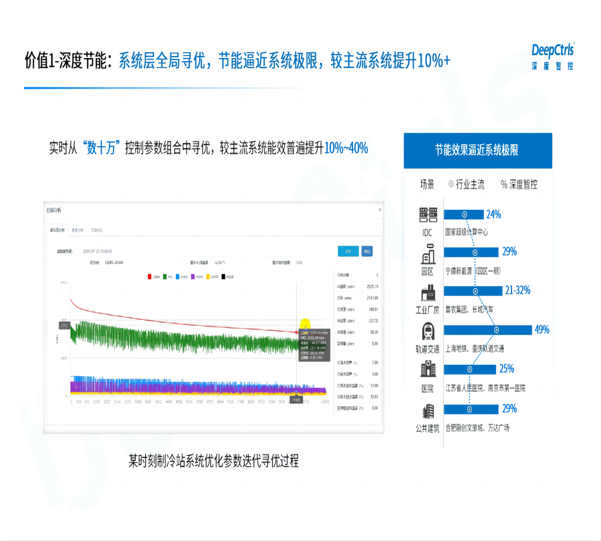 深度智控自主研发的深度AI节能系统(DeepSYS)基于全新一代”机理框架+AI“的高精度建模与寻优技术,针对暖通空调、空压等机电能源系统,建立设备层级高精度性能仿真模型 (模型预测误差RMSE<3%),在保障终端需求条件下,在系统层级实时遍历计算数十万种设备运行工况组合,寻优“系统总能耗最低时对应的最优运行工况”,实现系统层级的全局主动优化与闭环控制,逼近系统运行节能极限,平均节能率实现10-40%,超行业平均节能率10%以上,为业主创造可量化、可验证的节能改造收益。